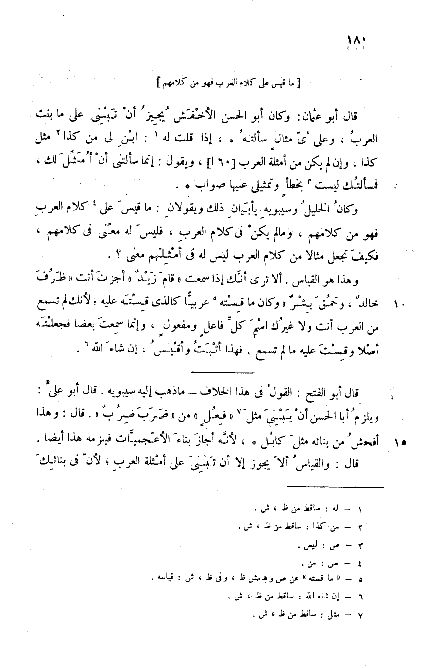 وهذا هو القياس. ألا ترى أنك إذا سمعت "قام زيد" أجزت أنت "ظرف خالد، وحمق بشر", وكان ما قسته5 عربيا كالذي قسته عليه؛ لأنك لم تسمع من العرب أنت ولا غيرك اسم كل فاعل ومفعول، وإنما سمعتَ بعضا فجعلتَهُ أصلا وقستَ عليه ما لم تسمع. فهذا أثبت وأقيس، إن شاء الله6.