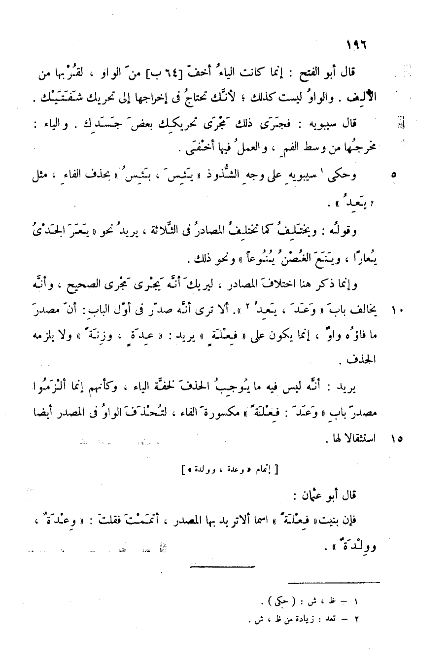 وإنما ذكر هنا اختلاف المصادر؛ ليريك أنه يجري مجرى الصحيح، وأنه يخالف باب "وعد، يعد2". ألا ترى أنه صدر في أول الباب: أن مصدر ما فاؤه واو، إنما يكون على "فِعْلة" يريد: "عِدَة، وزنة" ولا يلزمه الحذف.