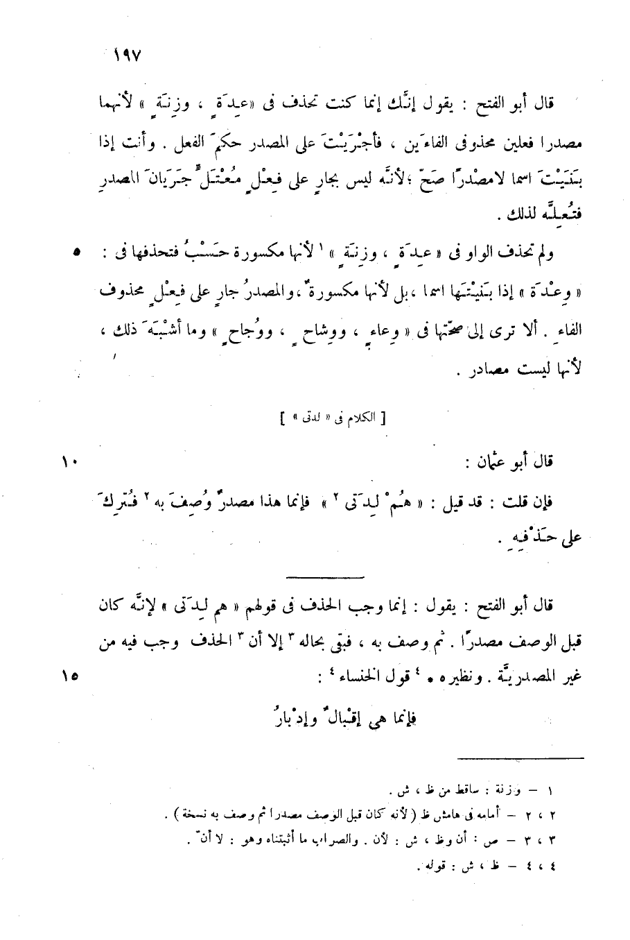 قال أبو الفتح: يقول: إنما وجب الحذف في قولهم: "هم لدتى"؛ لأنه كان قبل الوصف مصدرا. ثم وصف به، فبقي بحاله3, لا أن3 الحذف وجب فيه من غير المصدرية, ونظيره4 قول الخنساء4:
