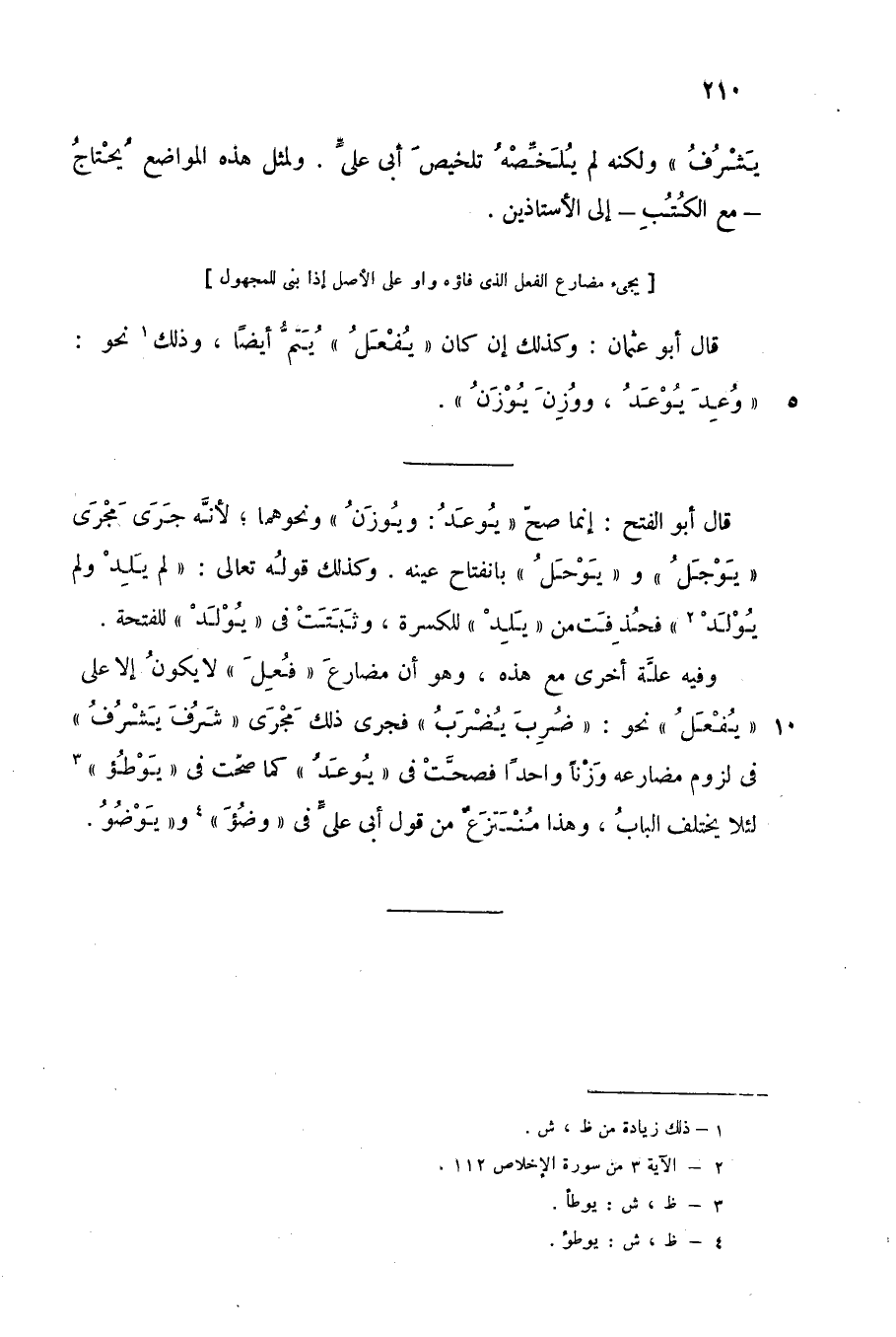 قال أبو الفتح: إنما صح "يوعد ويوزن" ونحوهما؛ لأنه جرى مجرى "يوجل"، و"يوحل" بانفتاح عينه, وكذلك قوله تعالى: {لَمْ يَلِدْ وَلَمْ يُولَدْ} 2 فحُذفت من "يلد" للكسرة, وثبتت في "يولد" للفتحة.