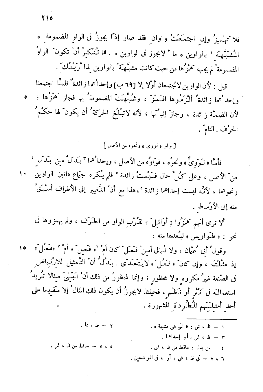 فأما "نووي" ونحوه, فواوه من الأصل، وإحداهما3 بدل من بدل4 من الأصل، وعلى كل حال فليست زائدة5, فلم يكره اجتماع هاتين الواوين ونحوهما؛ لأنه ليست إحداهما زائدة5، هذا مع أن التغيير إلى الأطراف أسبق منه إلى الأوساط.
