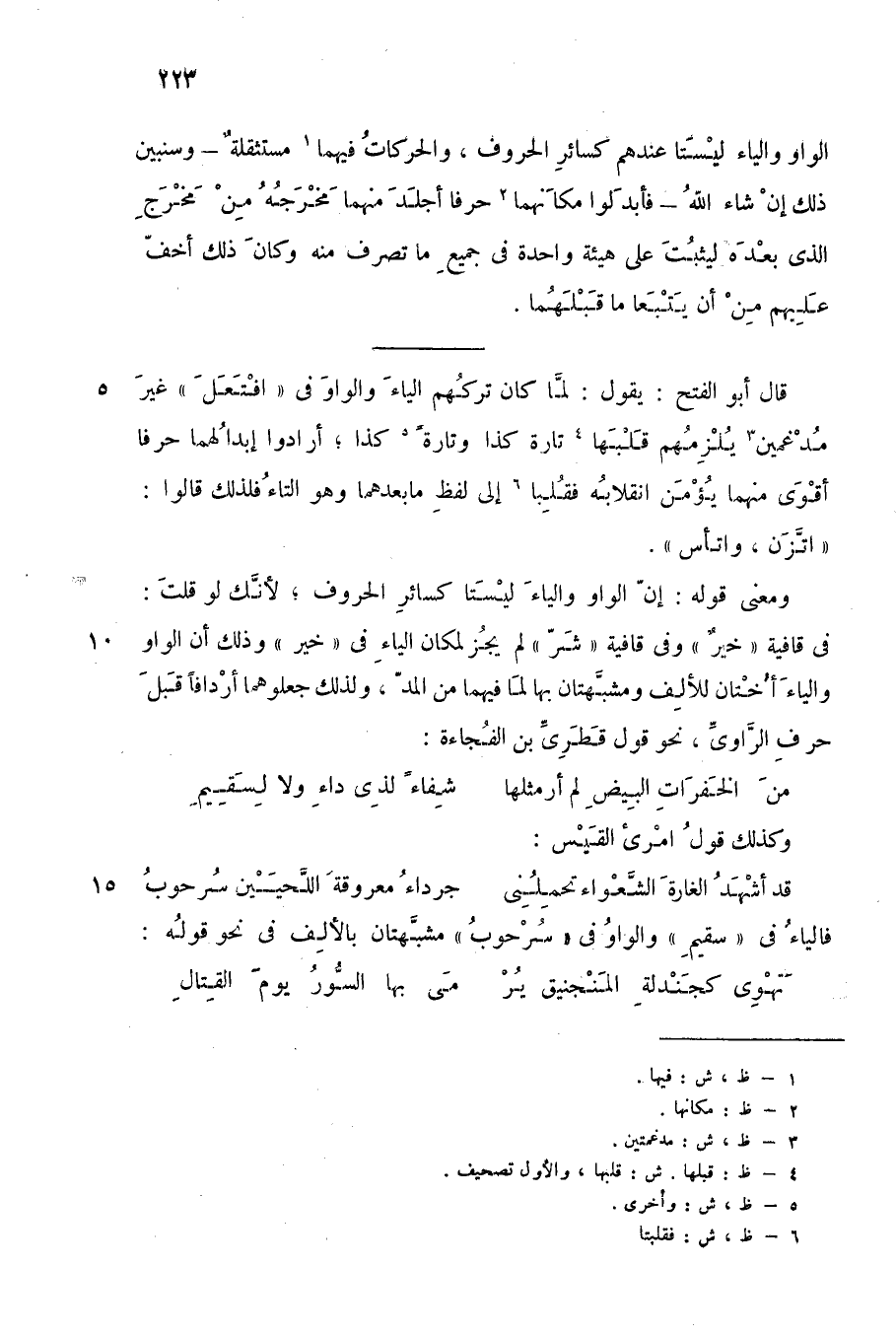 قال أبو الفتح: يقول: لما كان تركهم الباء والواو في "افتعل" غير مدغمين3 يُلزِمهم قلبهما4 تارة كذا وتارة5 كذا، أرادوا إبدالهما حرفا أقوى منهما يؤمن انقلابه, فقُلبا6 إلى لفظ ما بعدهما وهو التاء؛ فلذلك قالوا: "اتزن، واتأس".