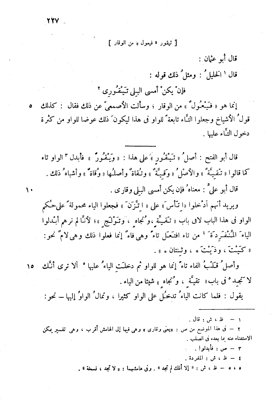 قال أبو الفتح: أصل "تَيْقُور" على هذا: "وَيْقُور", فأبدل3 الواو تاء كما قالوا: "تقية" والأصل: "وَقِيّة", وتُقاة وأصلها "وُقاة" وأشباه ذلك.