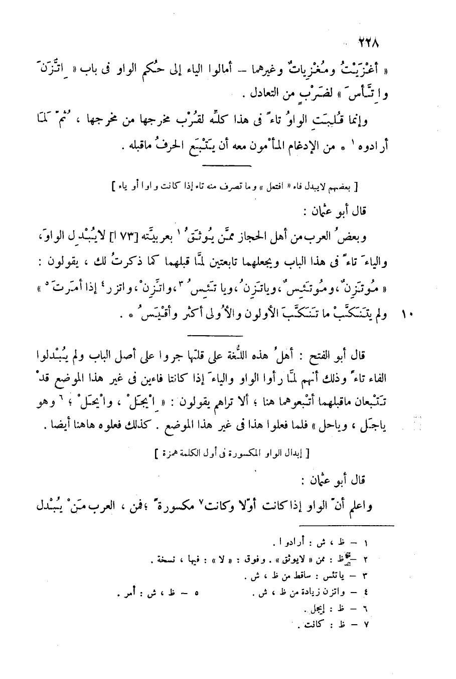 وبعض العرب من أهل الحجاز ممن يُوثَق2 بعربيته لا يبدل الواو، والياء تاء في هذا الباب, ويجعلهما تابعتين لما قبلهما كما ذكرت لك، يقولون: "مُوتَزِن, وموتئس، وياتَزِن، وياتئس3، واتَّزن, واتزر4, إذا أمرت"5, ولم يتنكب ما تنكب الأولون، والأولى أكثر وأقيس.