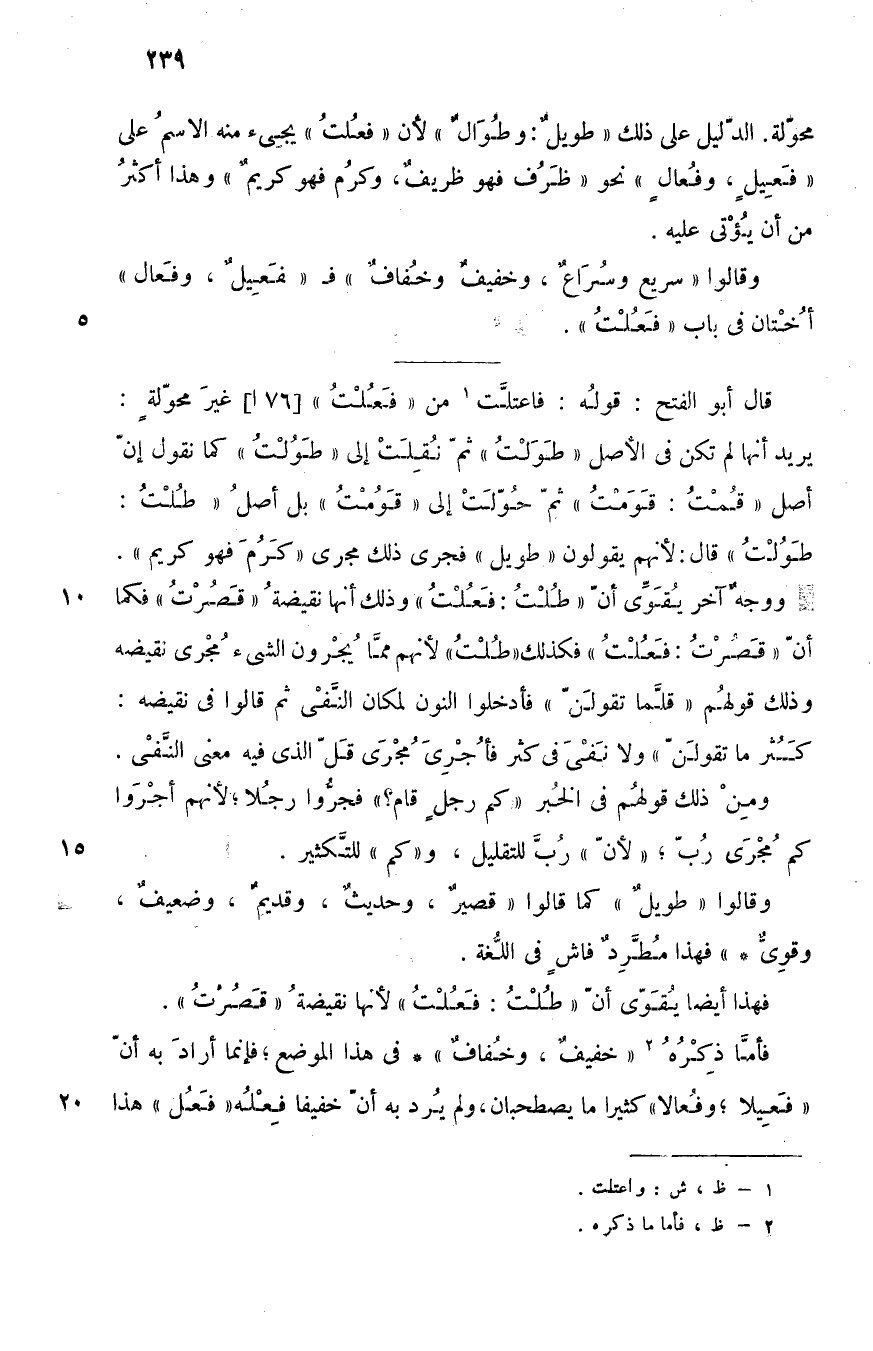 قال أبو الفتح: قوله: فاعتلت1 من "فعُلت" غير محولة, يريد: أنها لم تكن في الأصل "طَوَلْت", ثم نُقلت إلى "طَوُلت" كما تقول: إن أصل "قُمت: قَوَمت" ثم حُوِّلت إلى "قوُمت", بل أصل "طلت: طَوُلت", قال: لأنهم يقولون: "طويل", فجرى ذلك مجرى "كرم فهو كريم".