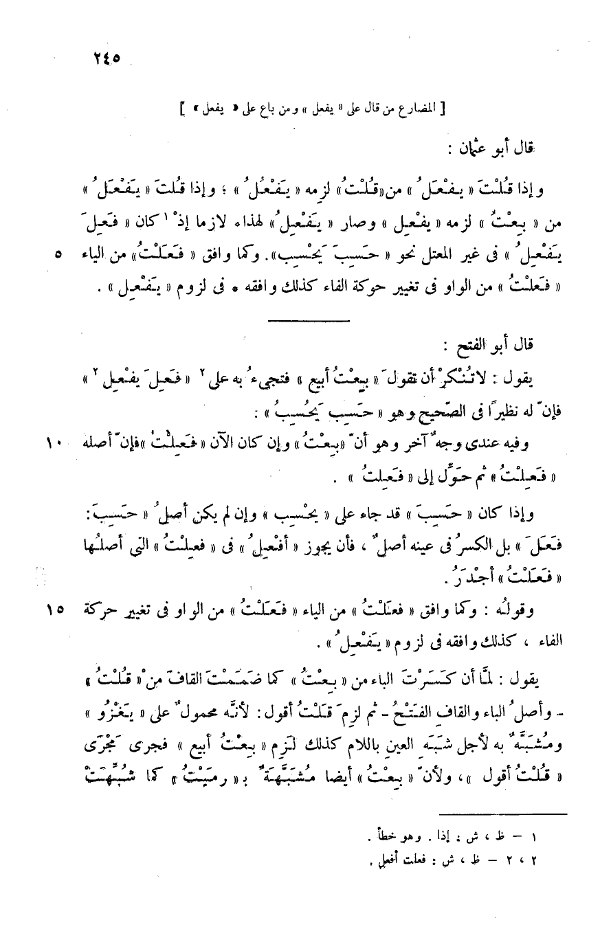 يقول: لا تنكر أن تقول: "بعت أبيع", فتجيء به على2 "فعِل يفعِل2", فإن له نظيرا في الصحيح وهو "حسِب يحسِب".