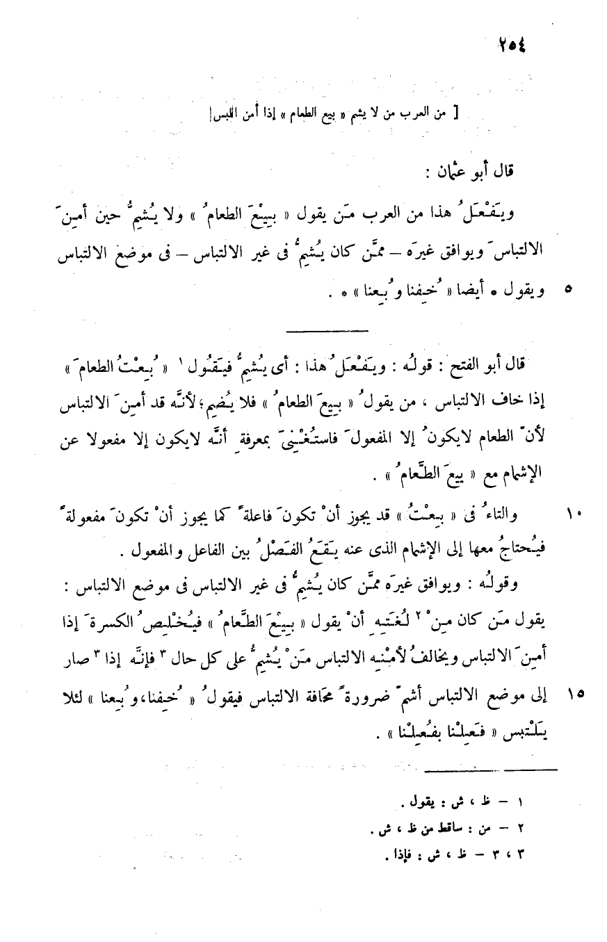 ويفعل هذا من العرب من يقول: "بيع الطعام" ولا يشم حين أمن الالتباس ويوافق غيره -ممن كان يشم في غير الالتباس- في موضع الالتباس ويقول أيضا: "خُِفنا، وبُِعنا".