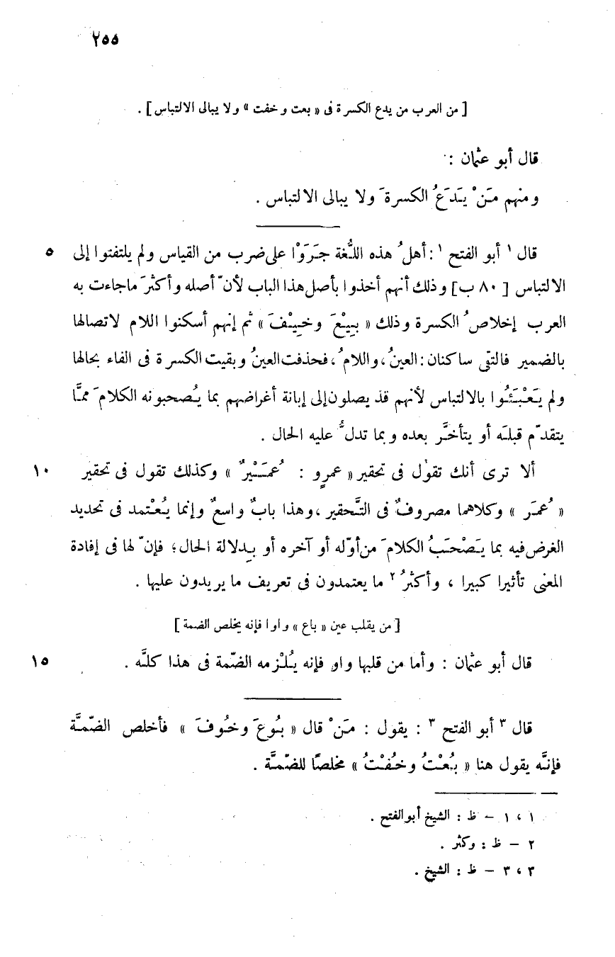 ألا ترى أنك تقول في تحقير "عمرو: عُمَيْر" وكذلك تقول في تحقير "عمر" وكلاهما مصروف في التحقير، وهذا باب واسع وإنما يعتمد في تحديد الغرض فيه بما يصحب الكلام من أوله، أو آخره، أو بدلالة الحال، فإن لها في إفادة المعنى تأثيرا كبيرا، وأكثر2 ما يعتمدون في تعريف ما يريدون عليها.