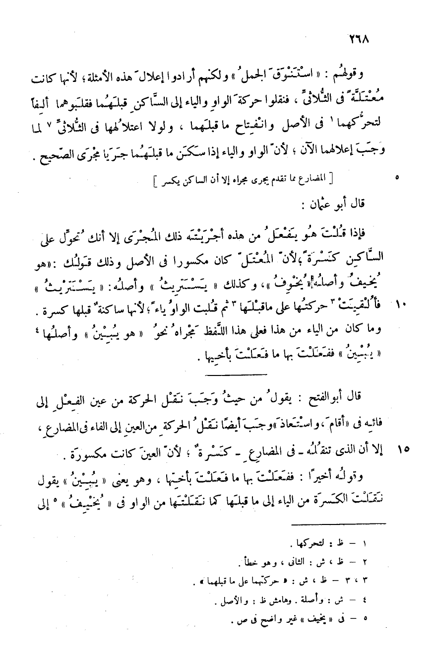 فإذا قلت: "هو يفعَل" من هذا أجريته ذلك المجرى, إلا أنك تحول على الساكن كسرة؛ لأن المعتل كان مكسورا في الأصل وذلك قولك: "هو يُخِيف" وأصله: "يُخْوِف", وكذلك "يسترِيث" وأصله: "يستَرْيِث", فأُلقيت3 حركتها على ما قبلها3 ثم قلبت الواو ياء؛ لأنها ساكنة قبلها كسرة. وما كان من الياء من هذا, فعلى هذا اللفظ مجراه نحو "هو يُبِين" وأصلها4: "يُبْيِن", ففعلت بها ما فعلت بأختها.
