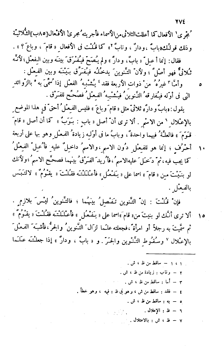 فإن قلت: إن التنوين يفصل بينهما، فالتنوين ليس بلازم. ألا ترى أنك لو بنيت من "قام" اسما على "يفعُلٍ" فأعللته فقلت: "يقوم", ثم سميت به رجلا أو امرأة, فجعلته عَلَما لزال التنوين والجر, فأشبه الفعل بالإعلال7 وسقوط التنوين والجر, و"باب، ودار" إذا جعلته عَلَما