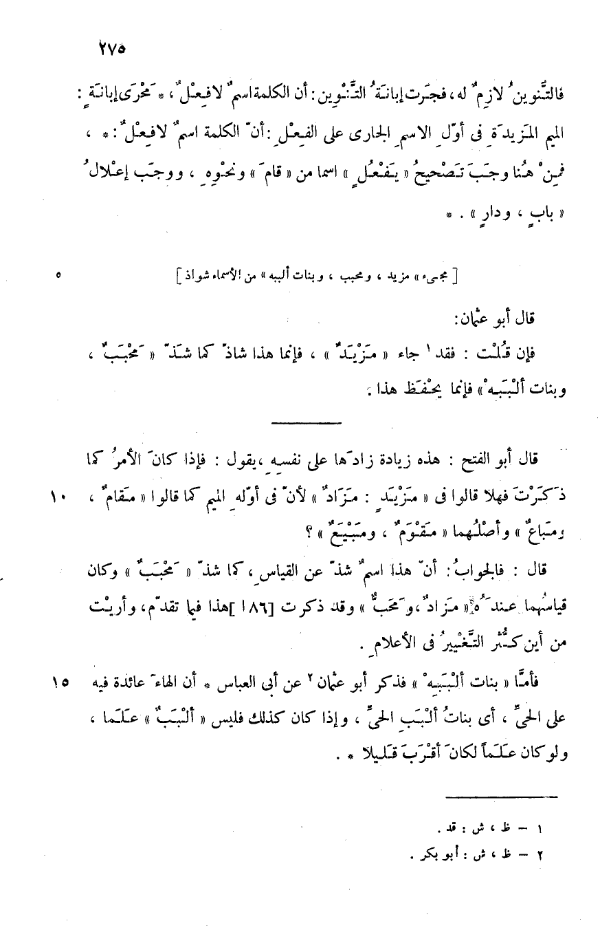 قال: فالجواب: أن هذا اسم شذ عن القياس كما شذ "محبب", وكان قياسهما عنده "مزادا، ومحبا" وقد ذكرت هذا فيما تقدم, وأريت من أين كثر التغيير في الأعلام.