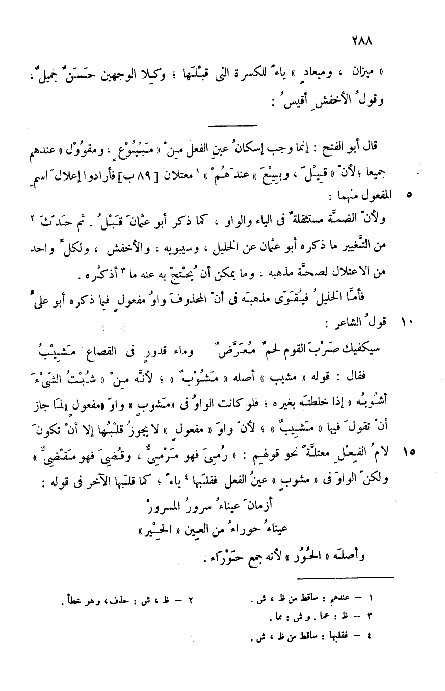 ولأن الضمة مستثقلة في الياء والواو، كما ذكر أبو عثمان قبل, ثم حدث2 من التغيير ما ذكره أبو عثمان عن الخليل, وسيبويه، والأخفش. ولكل واحد من الاعتلال لصحة مذهبه، وما يمكن أن يحتج به عنه, ما3 أذكره.