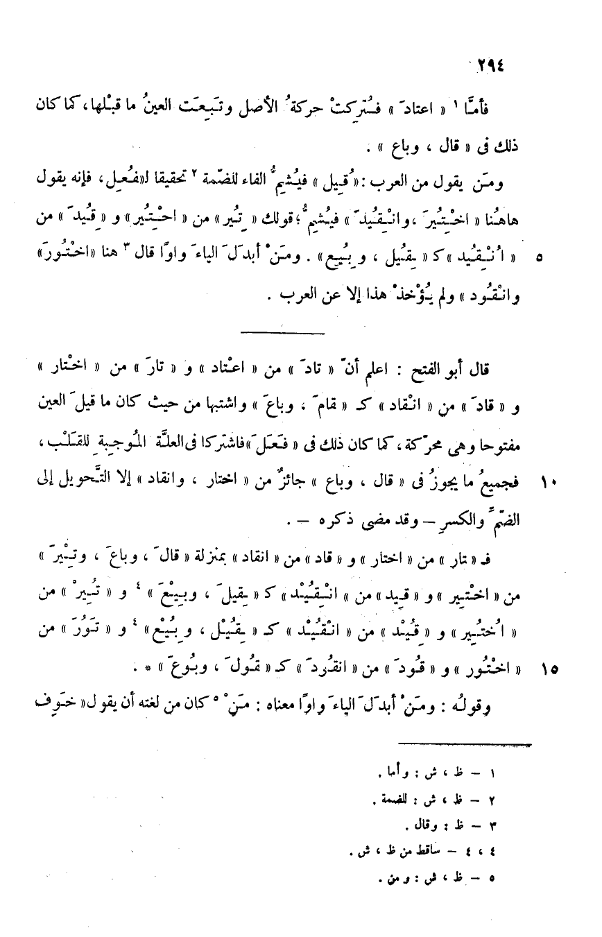 فـ "تار" من "اختار" و"قاد" من "انقاد" بمنزلة "قال، وباع" و"تير" من "اختير" و"قيد" من "انقيد" كـ "قيل، وبيع"4 و"تُِير" من "اُختُِير" و"قُِيد" من "انقيد" كـ "قُِيل, وبُِيع"4, و"تُور" من "اختُور" و"قُود" من "انقُود" كـ "قُول، وبُوع".