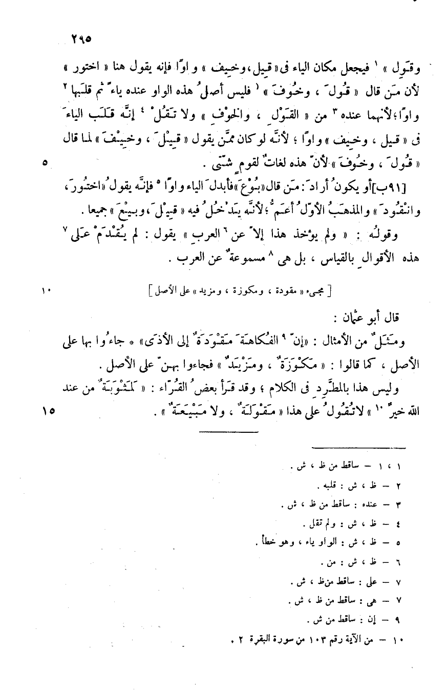 أو يكون أراد: من قال "بُوع" فأبدل الياء واوا5, فإنه يقول "اختُور, وانقُود" والمذهب الأول أعم؛ لأنه يدخل فيه" قيل, وبيع" جميعا.