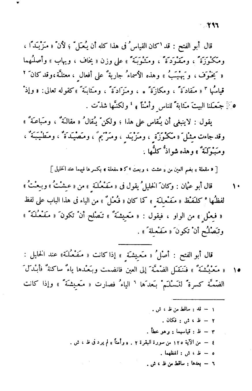 قال أبو عثمان: وكان الخليل يقول في "مَفْعُلة" من "عشت، وبعت" لفظها5 كلفظ "مَفْعِلة" كما كان "فُعْل" من الياء في هذا الباب على لفظ "فِعْل" من الواو، فيقول: "مَعِيشة" تصلح أن تكون "مَفْعُلة" وتصلح أن تكون "مَفْعِلة".