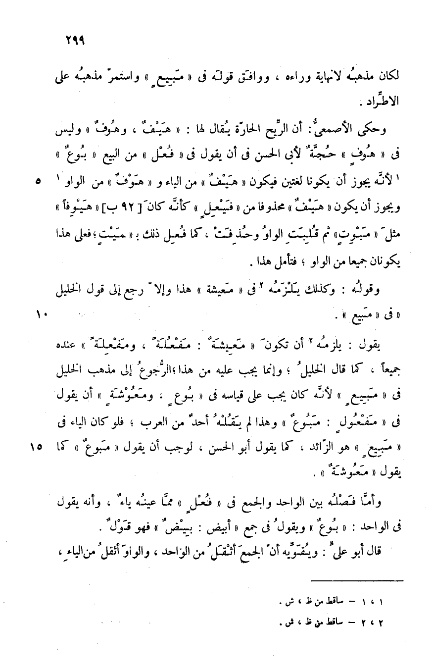 يقول: يلزمه2 أن تكون "معيشة: مفعُلة، ومفعِلة" عنده جميعا، كما قال الخليل، وإنما يجب عليه من هذا, الرجوع إلى مذهب الخليل في "مبيع"؛ لأنه كان يجب على قياسه في "بوع، ومعوشة" أن يقول في "مفعول: مَبُوع", وهذا لم يقله أحد من العرب، فلو كان الياء في "مبيع" هو الزائد كما يقول أبو الحسن؛ لوجب أن يقول: "مَبوع" كما يقول "مَعُوشة".