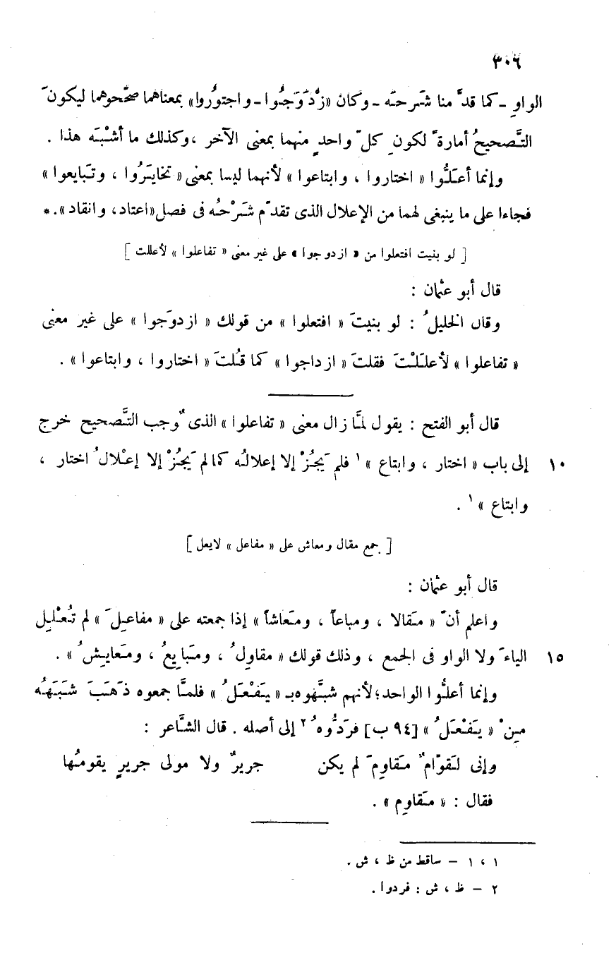 الواو -كما قدمنا شرحه- وكان "ازدوجوا, واجتوروا" بمعناهما صححوهما ليكون التصحيح أمارة لكون كل واحد منهما بمعنى الآخر, وكذلك ما أشبه هذا.