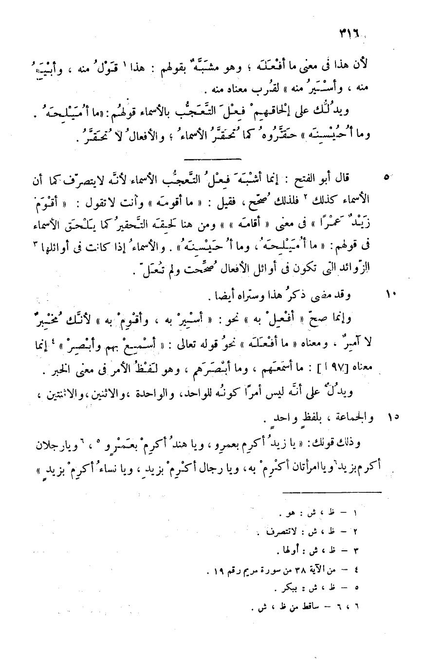 قال أبو الفتح: إنما أشبه فعل التعجب الأسماء؛ لأنه لا يتصرف كما أن الأسماء كذلك2؛ فلذلك صحح، فقيل: "ما أقومه" وأنت لا تقول: "أقْوَمَ زيد عمرا" في معنى "أقامه", ومن هنا لحقه التحقير كما يلحق الأسماء في قولهم: "ما أميلحه, وما أحيسنه" والأسماء إذا كانت في أوائلها3 الزوائد التي تكون في أوائل الأفعال, صححت ولم تعل.