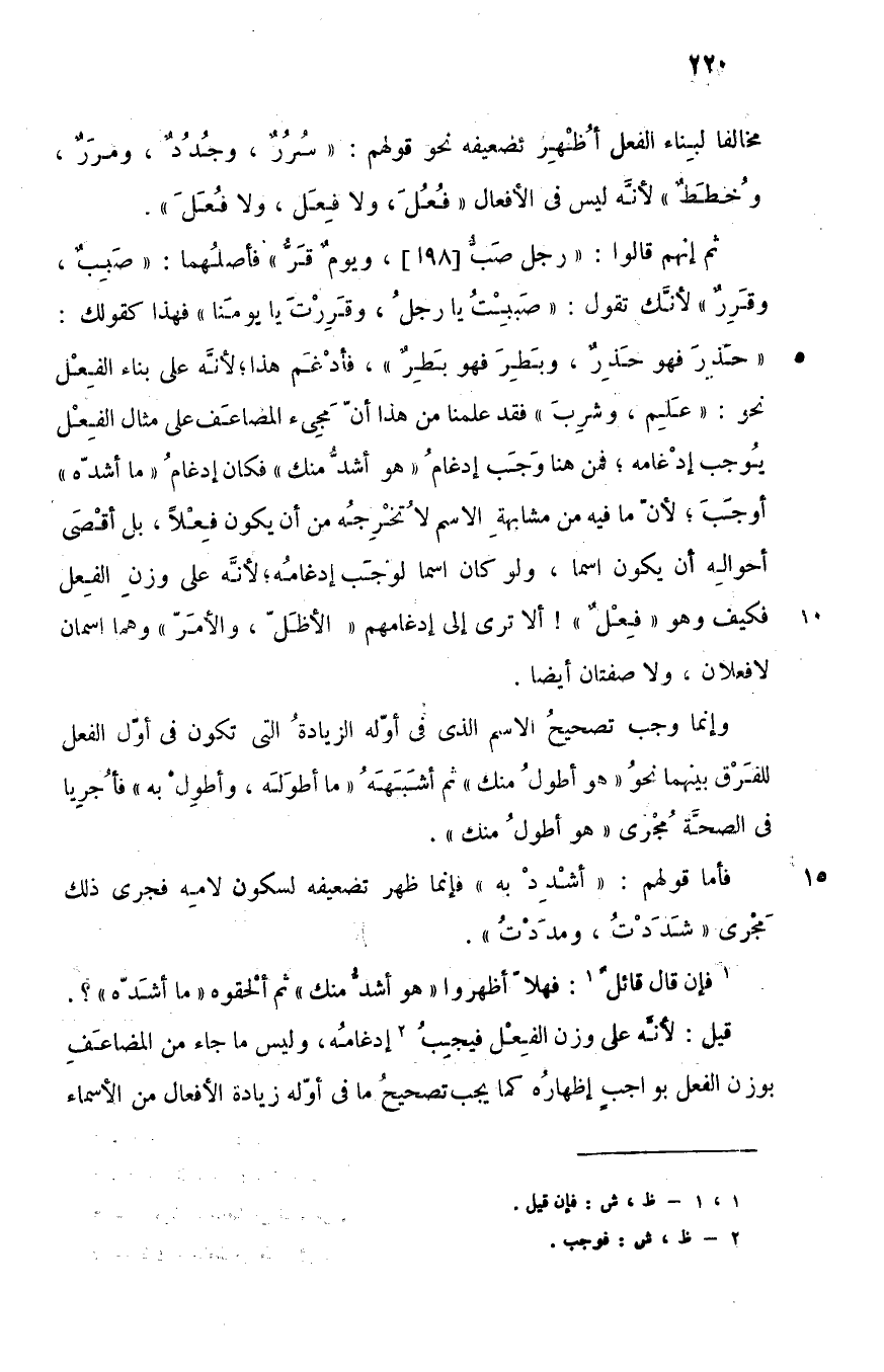 ثم إنهم قالوا: "رجل صَبّ، ويوم قَرّ" فأصلهما: "صَبِب، وقَرِر"؛ لأنك تقول: "صَبِبت يا رجل, وقررت يا يومنا" فهذا كقولك: "حَذِر فهو حذر، وبطر فهو بطر" فأدغم هذا؛ لأنه على بناء الفعل نحو: "علم، وشرب" فقد علمنا من هذا أن مجيء المضاعف على مثال الفعل يوجب إدغامه، فمن هنا وجب إدغام "هو أشد منك", فكان إدغام "ما أشده" أوجب؛ لأن ما فيه من مشابهة الاسم لا تخرجه من أن يكون فعلا، بل أقصى أحواله أن يكون اسما، ولو كان اسما لوجب إدغامه؛ لأنه على وزن الفعل, فكيف وهو "فعل"! ألا ترى إلى إدغامهم "الأظَلّ، والأمَرّ" وهما اسمان لا فعلان، ولا صفتان أيضا.