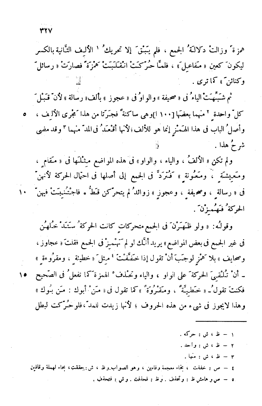 ولم تكن "الألف، والياء، والواو" في هذه المواضع مثلها في "مَقَام, ومَعِيشة, ومَعُونة" فتُرَد في الجمع إلى أصلها في احتمال الحركة؛ لأنهن في "رسالة, وصحيفة, وعجوز" زوائد لم يتحركن قط, فاجتنبت فيهن الحركة فهمزن.