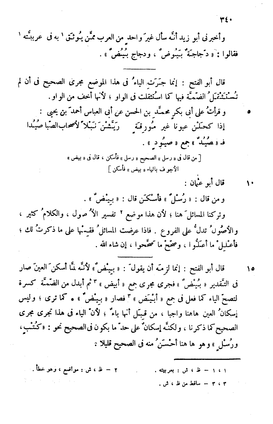 وأخبرني أبو زيد أنه سأل غير واحد من العرب ممن يوثق1 به في عربيته1 فقالوا: "دجاجة بَيُوض، ودجاج بُيُض".