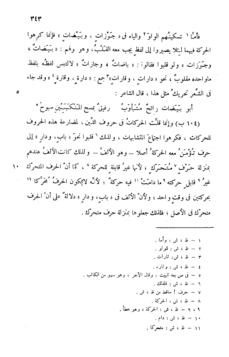 فأما1 تسكينهم الواو2 والياء في "جَوْزات, وبَيْضات", فإنما كرهوا الحركة فيهما لئلا يصيروا إلى لفظ يجب معه القلب، وهو قولهم: "بَيَضات, وجَوَزات" ولو قلبوا فقالوا: "باضات, وجازات" لالتبس لفظه بلفظ ما واحده مقلوب نحو "دارات، وقارات"3 جمع: "دارة، وقارة4", وقد جاء في الشعر تحريك مثل هذا، قال الشاعر: