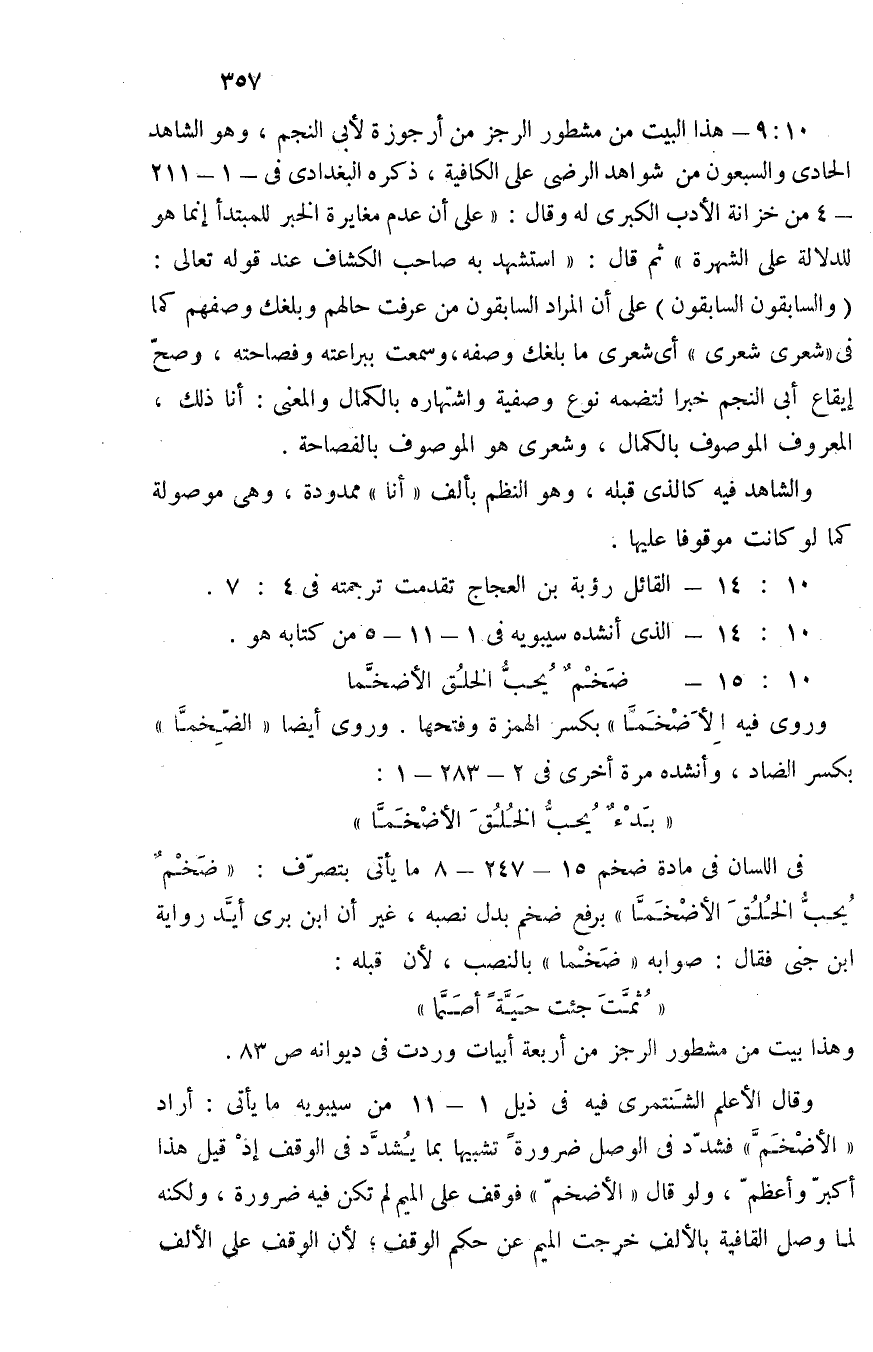 وقال الأعلم الشنتمري فيه في ذيل 1-11 من سيبويه ما يأتي: أراد "الأضخم" فشدد في الوصل ضرورة تشبيها بما يشدد في الوقف, إذ قيل هذا أكبر وأعظم، ولو قال: "الأضخم" فوقف على الميم لم تكن فيه ضرورة، ولكنه لما وصل القافية بالألف خرجت الميم عن حكم الوقف؛ لأن الوقف على الألف