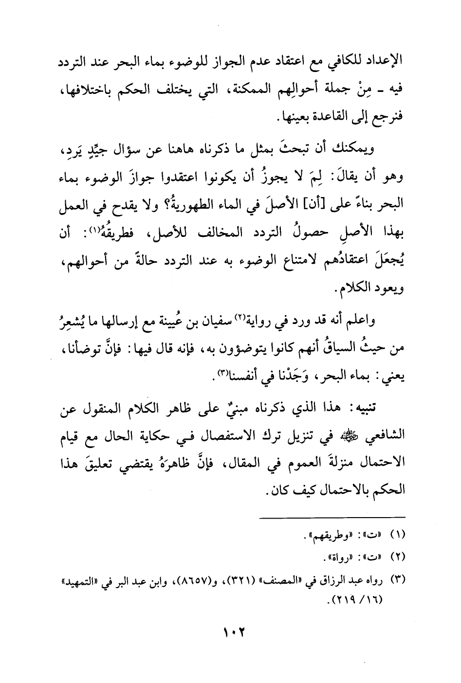 ويمكنك أن تبحثَ بمثل ما ذكرناه هاهنا عن سؤال جيّدٍ يَردِ، وهو أن يقالَ: لِمَ لا يجوزُ أن يكونوا اعتقدوا جوازَ الوضوء بماء البحر بناءً على [أن] الأصلَ في الماء الطهوريةُ؟ ولا يقدح في العمل بهذا الأصلِ حصولُ التردد المخالف للأصل، فطريقُهُ (¬1): أن يُجعَلَ اعتقادُهم لامتناع الوضوء به عند التردد حالةً من أحوالهم، ويعود الكلام.