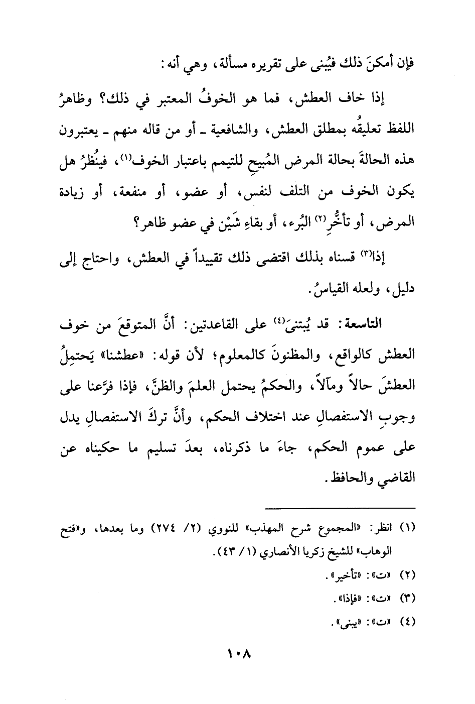 إذا خاف العطش، قما هو الخوفُ المعتبر في ذلك؟ وظاهرُ اللفظ تعليقُه بمطلق العطش، والشافعية - أو من قاله منهم - يعتبرون هذه الحالةَ بحالة المرض المُبيحِ للتيمم باعتبار الخوف (¬1)، فينُظرُ هل يكون الخوف من التلف لنفس، أو عضو، أو منفعة، أو زيادة المرض، أو تأخُّرِ (¬2) البُرء، أو بقاءِ شَيْن في عضو ظاهر؟
