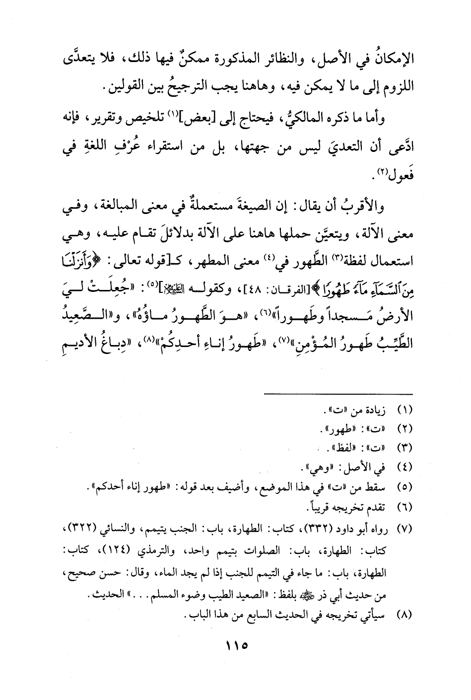 والأقربُ أن يقال: إن الصيغةَ مستعملةٌ في معنى المبالغة، وفي معنى الآلة، ويتعيَّن حملها هاهنا على الآلة بدلائلَ تقام عليه، وهي استعمال لفظة (¬3) الطَّهور في (¬4) معنى المطهر، كـ[قوله تعالى: {وَأَنْزَلْنَا مِنَ السَّمَاءِ مَاءً طَهُورًا} [الفرقان: 48]، وكقوله عليه السلام] (¬5): "جُعِلَتْ ليَ الأرضُ مَسجداً وطَهوراً" (¬6)، "هوَ الطَّهورُ ماؤُهُ"، و"الصَّعِيدُ الطَّيِّبُ طَهورُ المُؤْمِنِ" (¬7)، "طَهورُ إناءِ أحدِكُمْ" (¬8)، "دِباغُ الأديمِ