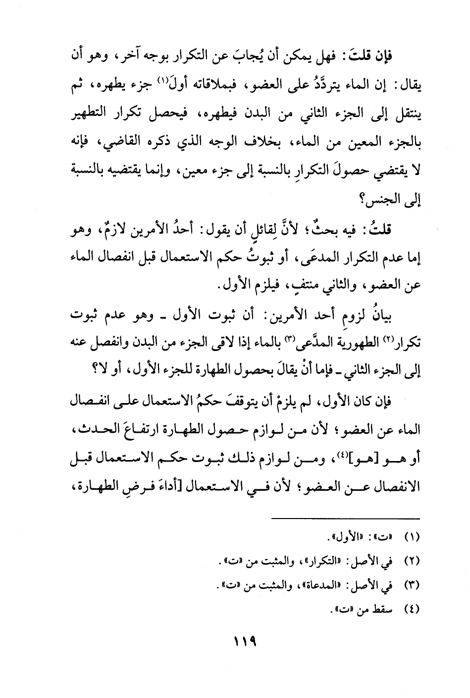 بيانُ لزومِ أحد الأمرين: أن ثبوت الأول - وهو عدم ثبوت تكرار (¬2) الطهورية المدَّعى (¬3) بالماء إذا لاقى الجزء من البدن وانفصل عنه إلى الجزء الثاني - فإما أنْ يقالَ بحصول الطهارة للجزء الأول، أو لا؟