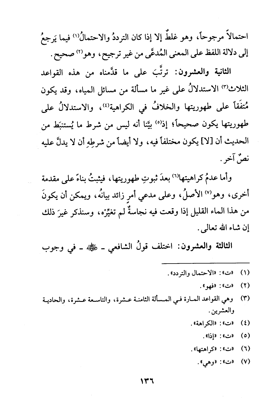 الثانية والعشرون: ترتَّبَ على ما قدَّمناه من هذه القواعد الثلاث (¬3) الاستدلالُ على غير ما مسألة من مسائل المياه، وقد يكون مُتفَقاً على طهوريتها والخلافُ في الكراهية (¬4)، والاستدلالُ على طهوريتها يكون صحيحاً؛ إذ (¬5) بيَّنا أنه ليس من شرط ما يُستنبَط من الحديث أن [لا] يكون مختلفا فيه، ولا أيضاً من شرطِهِ أن لا يدلَّ عليه نص آخر.