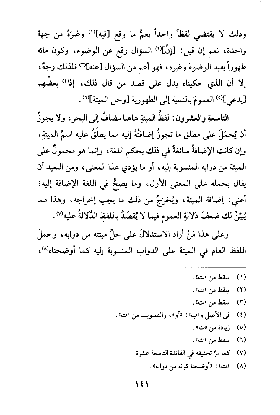 التاسعة والعشرون: لفظُ الميتةِ هاهنا مضافٌ إلى البحر، ولا يجوزُ أن يُحمَلَ على مطلق ما تجوزُ إضافتُهُ إليه مما يطلَقُ عليه اسمُ الميتةِ، وإن كانت الإضافةُ سائغة في ذلك بحكم اللغة، وإنما هو محمولٌ على الميتة من دوابه المنسوبة إليه، أو ما يؤدي هذا المعنى، ومن البعيد أن يقال بحمله على المعنى الأول، وما يصحُّ في اللغة الإضافة إليه؛ أعني: إضافة الميتة، ويُخرَجُ من ذلك ما يجب إخراجه، وهذا مما يُبيِّنُ لك ضعفَ دَلالةِ العموم فيما لا يُقصَدُ باللفظِ الدَّلالةُ عليه (¬7).