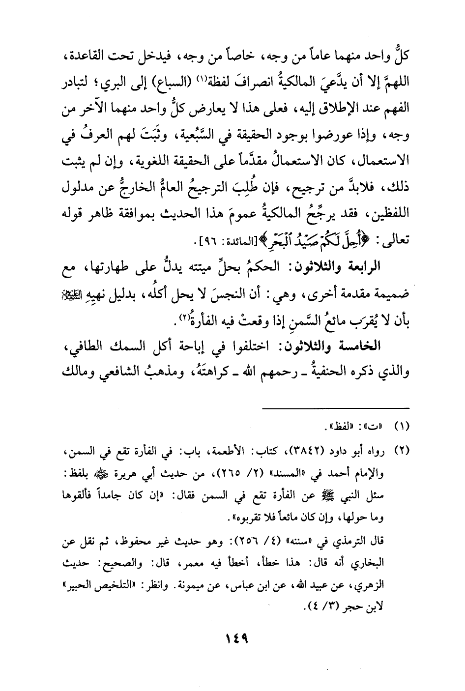 الرابعة والثلاثون: الحكمُ بحلّ ميتته يدلُّ على طهارتها، مع ضميمة مقدمة أخرى، وهي: أن النجسَ لا يحل أكلُه، بدليل نهيِهِ عليه السلام بأن لا يُقرَب مائعُ السَّمنِ إذا وقعتْ فيه الفأرةُ (¬2).