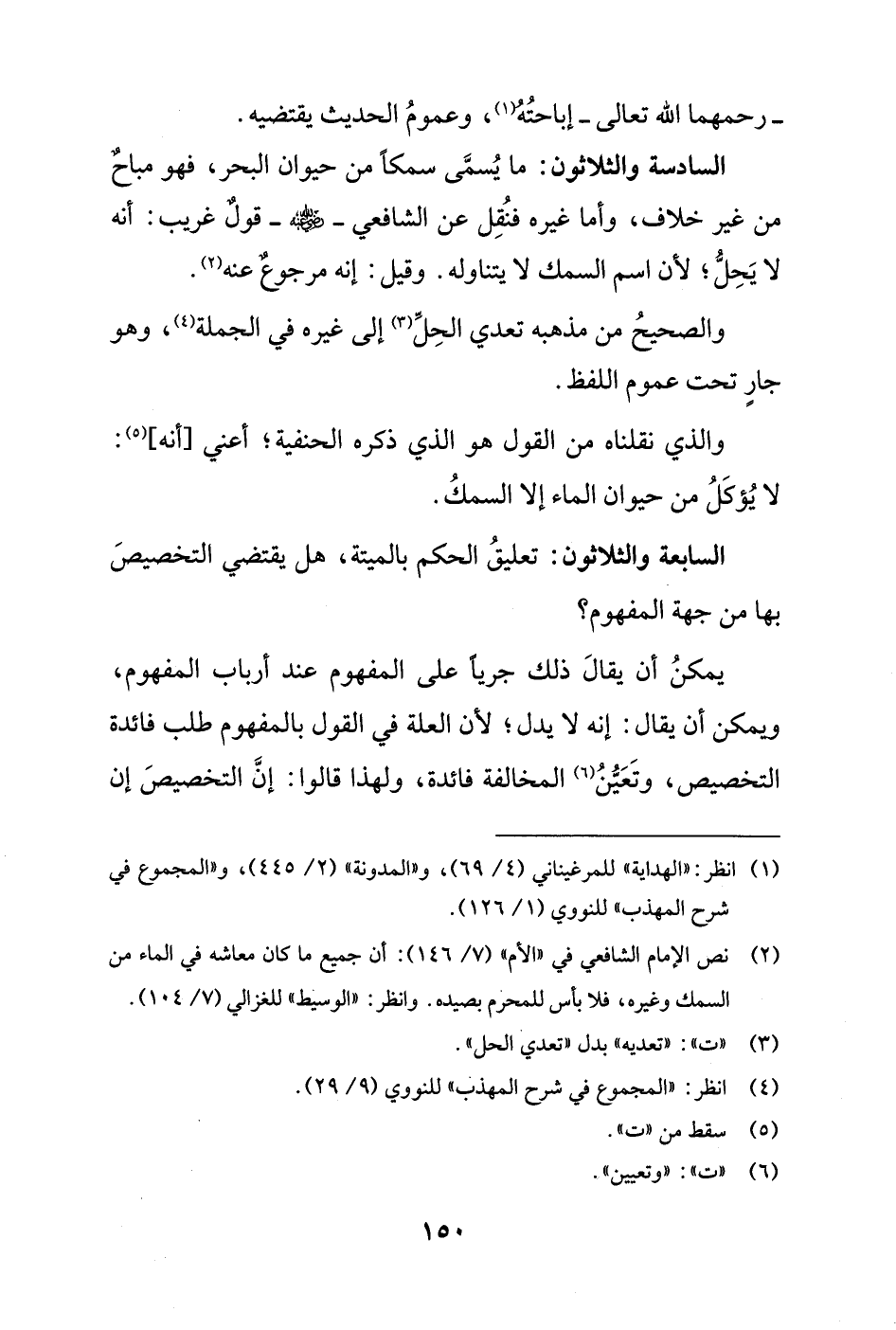 السادسة والثلاثون: ما يُسمَّى سمكاً من حيوان البحر، فهو مباحٌ من غير خلاف، وأما غيره فنُقِل عن الشافعي - صلى الله عليه وسلم - قولٌ غريب: أنه لا يَحِلُّ؛ لأن اسم السمك لا يتناوله. وقيل: إنه مرجوع عنه (¬2).
