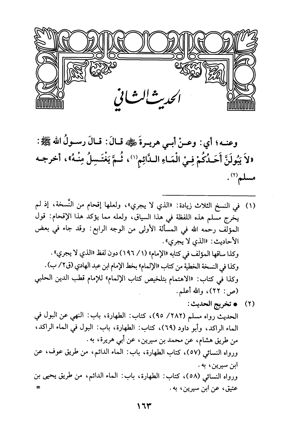 وعنه؛ أي: وعنْ أبي هريرةَ - رضي الله عنه - قالَ: قالَ رسولُ الله - صلى الله عليه وسلم -: "لاَ يَبُولَنَّ أَحَدكمْ فِيْ الْمَاء الدَّائِم (¬1)، ثُمَّ يَغْتَسِلُ مِنْهُ"، أخرجه مسلم (¬2).