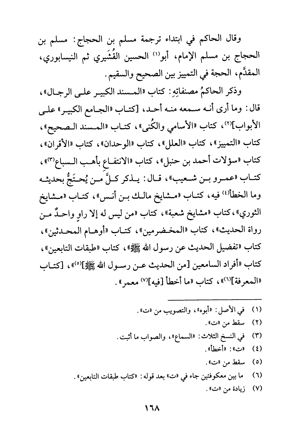 وقال الحاكم في ابتداء ترجمة مسلم بن الحجاج: مسلم بن الحجاج بن مسلم الإمام، أبو (¬1) الحسين القُشَيري ثم النيسابوري، المقدَّم، الحجة في التمييز بين الصحيح والسقيم.