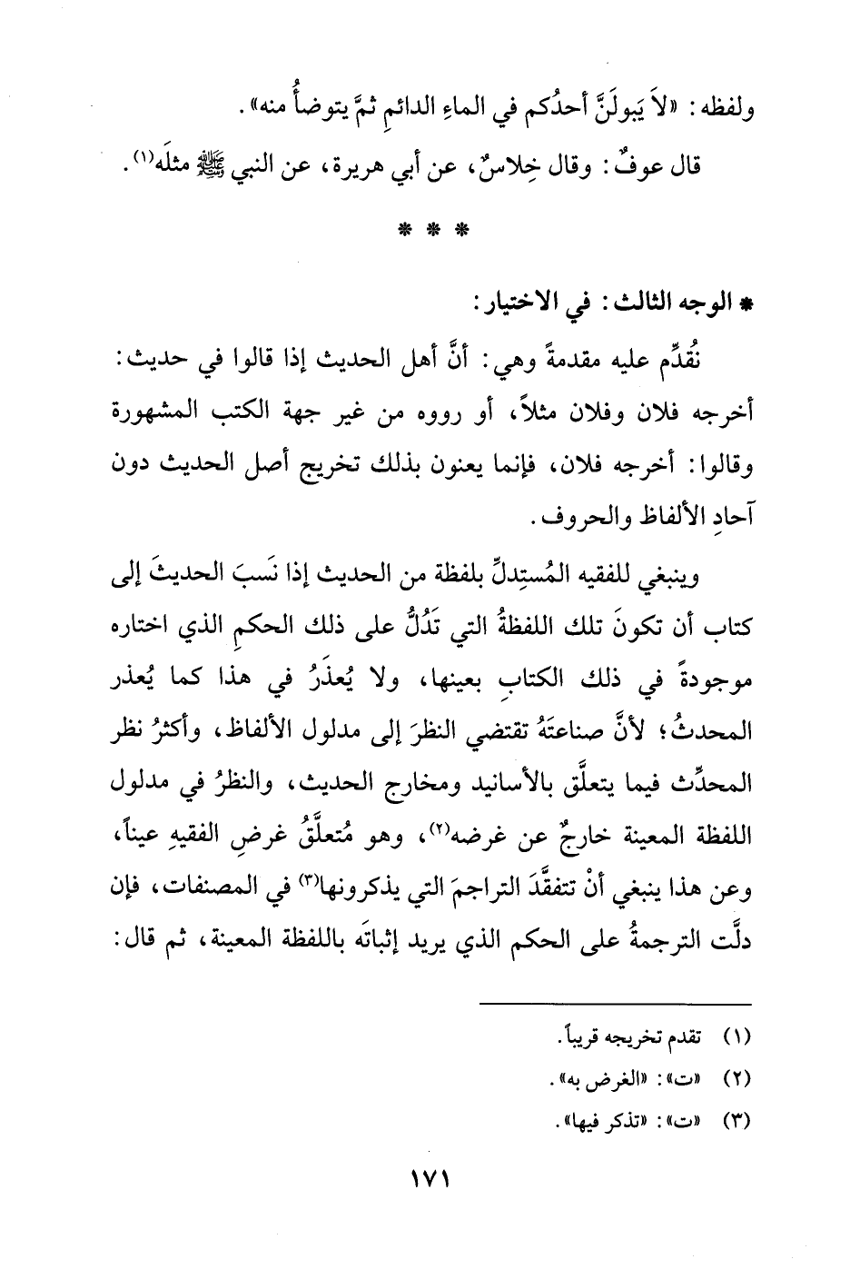 وينبغي للفقيه المُستِدلِّ بلفظة من الحديث إذا نسَبَ الحديثَ إلى كتاب أن تكونَ تلك اللفظةُ التي تَدُلُّ على ذلك الحكمِ الذي اختاره موجودةً في ذلك الكتابِ بعينها، ولا يُعذَرُ في هذا كما يُعذر المحدثُ؛ لأنَّ صناعتَهُ تقتضي النظرَ إلى مدلول الألفاظ، وأكثرُ نظر المحدّث فيما يتعلَّق بالأسانيد ومخارج الحديث، والنظرُ في مدلول اللفظة المعينة خارج عن غرضه (¬2)، وهو مُتعلَّقُ غرضِ الفقيهِ عيناً، وعن هذا ينبغي أنْ تتفقَّدَ التراجمَ التي يذكرونها (¬3) في المصنفات، فإن دلَّت الترجمةُ على الحكم الذي يريد إثباتَه باللفظة المعينة، ثم قال: