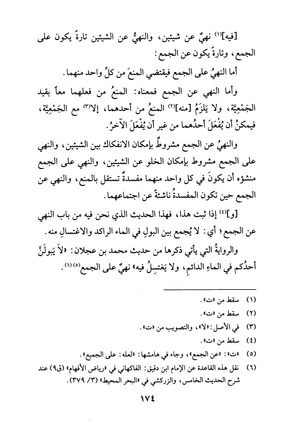 والروايةُ التي يأتي ذكرها من حديث محمد بن عجلان: "لاَ يَبولَنَّ أحدُكم في الماءِ الدائمِ، ولا يَغتسِلُ فيه" نهيٌ على الجمع (¬5) (¬6).