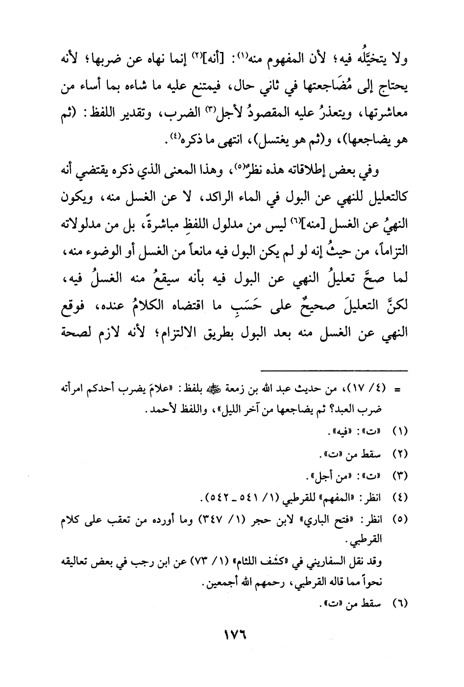 وفي بعض إطلاقاته هذه نظرٌ (¬5)، وهذا المعنى الذي ذكره يقتضي أنه كالتعليل للنهي عن البول في الماء الراكد، لا عن الغسل منه، ويكون النهيُ عن الغسل [منه] (¬6) ليس من مدلول اللفظِ مباشرةً، بل من مدلولاته إلْزاماً، من حيثُ إنه لو لم يكن البول فيه مانعاً من الغسل أو الوضوء منه، لما صحَّ تعليلُ النهي عن البول فيه بأنه سيقعُ منه الغسلُ فيه، لكنَّ التعليلَ صحيحٌ على حَسَبِ ما اقتضاه الكلامُ عنده، فوقع النهي عن الغسل منه بعد البول بطريق الالتزام؛ لأنه لازم لصحة