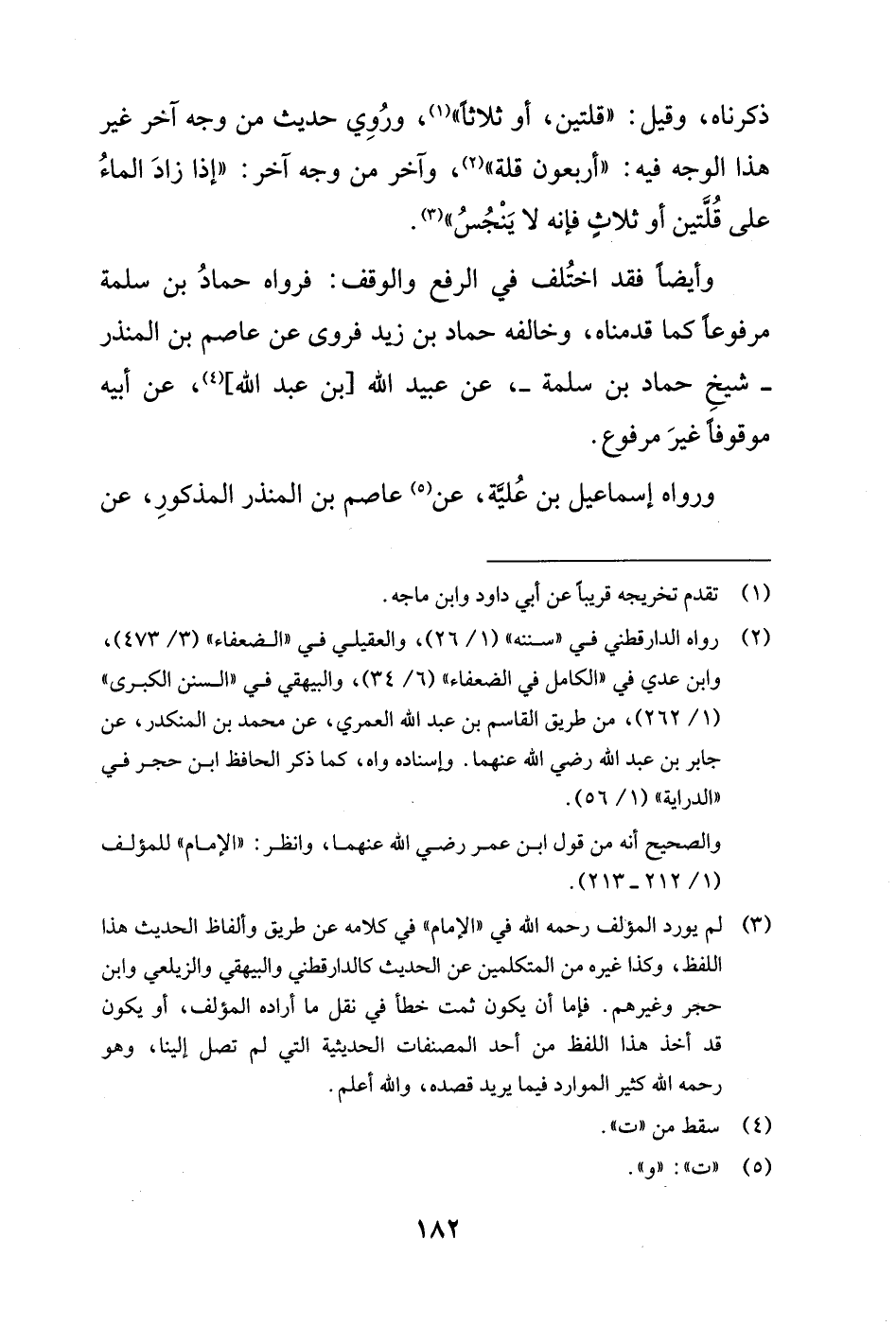 (¬3) لم يورد المؤلف رحمه الله في "الإمام" في كلامه عن طريق وألفاظ الحديث هذا اللفظ، وكذا غيره من المتكلمين عن الحديث كالدارقطني والبيهقي والزيلعي وابن حجر وغيرهم. فإما أن يكون ثمت خطأ في نقل ما أراده المؤلف، أو يكون قد أخذ هذا اللفظ من أحد المصنفات الحديثية التي لم تصل إلينا، وهو رحمه الله كثير الموارد فيما يريد قصده، والله أعلم.