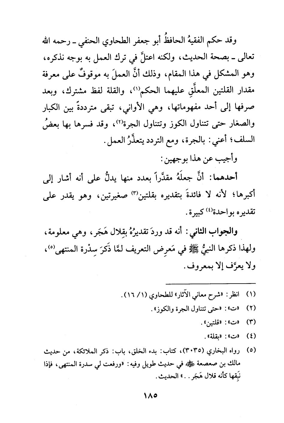 والجواب الثاني: أنه قد وردَ تقديرُهُ بقِلال هَجَر، وهي معلومة، ولهذا ذكرها النبيُّ - صلى الله عليه وسلم - في مَعرِض التعريف لمَّا ذَكرَ سدْرة المنتهى (¬5)، ولا يعرَّف إلا بمعروف.
