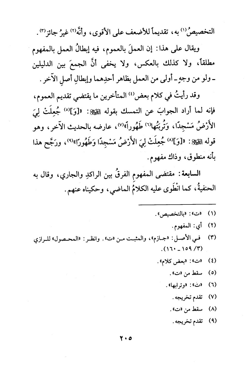وقد رأيتُ في كلام بعض (¬4) المتأخرين ما يقتضي تقديم العموم، فإنه لما أراد الجوابَ عن التمسك بقوله عليه السلام: [وَ] (¬5) جُعِلَتْ لِيَ الأَرْضُ مَسْجِدًا، وَتُربَتُها (¬6) طَهُورًا" (¬7)، عارضه بالحديث الآخر، وهو قوله عليه السلام: [وَ] (¬8) جُعِلَتْ لِيَ الأَرْضُ مَسْجِدًا وَطَهُورًا" (¬9)، ورَجَّح هذا بأنه منطوق، وذاك مفهوم.