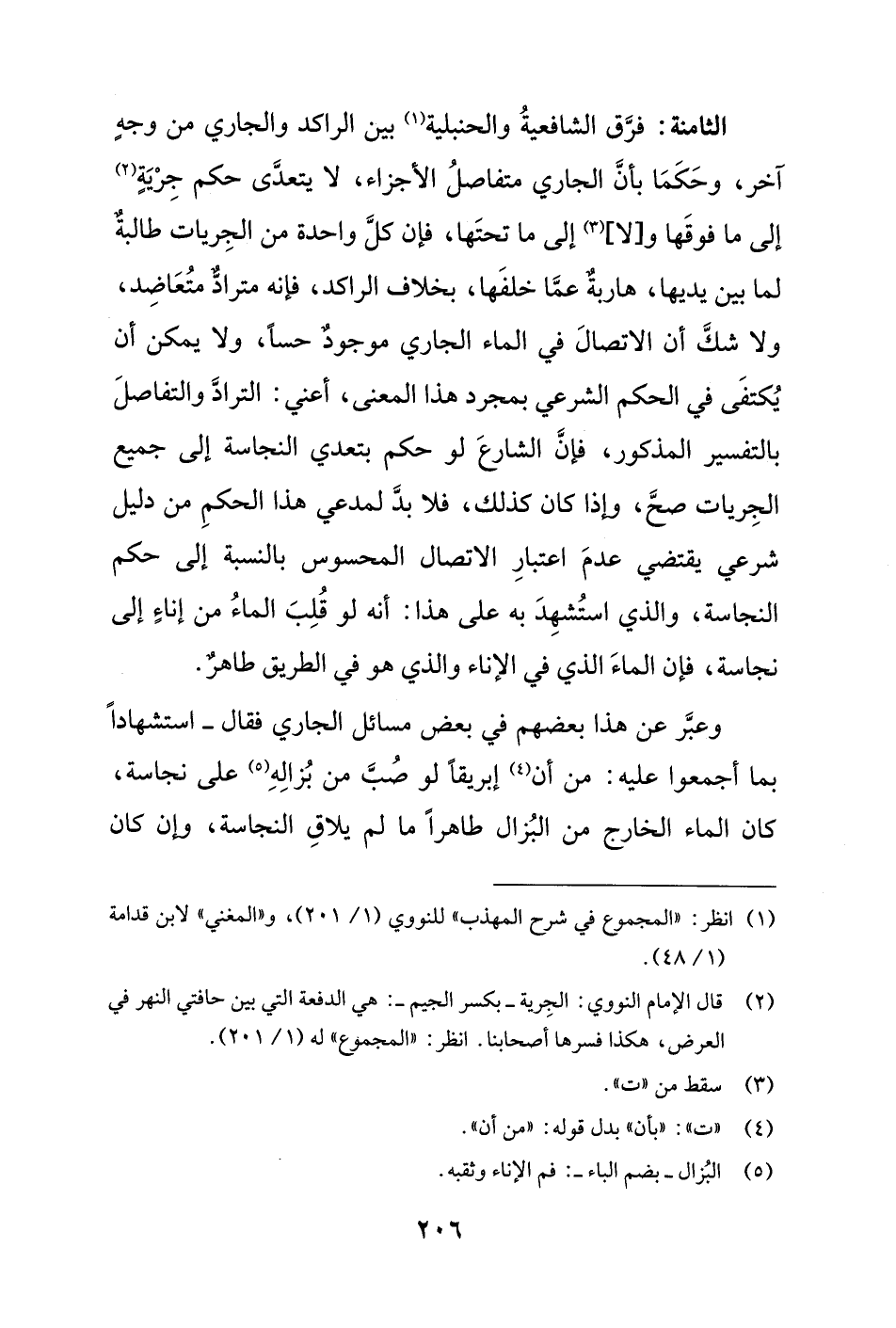الثامنة: فرَّق الشافعيةُ والحنبلية (¬1) بين الراكد والجاري من وجهٍ آخر، وحَكَمًا بأنَّ الجاري متفاصلُ الأجزاء، لا يتعدَّى حكم جِرْيَةٍ (¬2) إلى ما فوقَها و [لا] (¬3) إلى ما تحتَها، فإن كلَّ واحدة من الجِريات طالبةٌ لما بين يديها، هاربةٌ عمَّا خلفَها، بخلاف الراكد، فإنه مترادٌّ متُعَاضِد، ولا شكَّ أن الاتصالَ في الماء الجاري موجودٌ حسًا، ولا يمكن أن يُكتفَى في الحكم الشرعي بمجرد هذا المعنى، أعني: الترادَّ والتفاصلَ بالتفسير المذكور، فإنَّ الشارعَ لو حكم بتعدي النجاسة إلى جميع الجِريات صحَّ، وإذا كان كذلك، فلا بدَّ لمدعي هذا الحكمِ من دليل شرعي يقتضي عدمَ اعتبارِ الاتصال المحسوس بالنسبة إلى حكم النجاسة، والذي استُشهِدَ به على هذا: أنه لو قُلِبَ الماءُ من إناءٍ إلى نجاسة، فإن الماءَ الَّذي في الإناء والذي هو في الطريق طاهرٌ.
