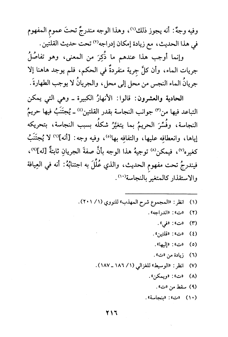 الحادية والعشرون: قالوا: الأنهارُ الكبيرة - وهي التي يمكن التباعد فيها من (¬3) جوانب النجاسة بقدر القلتين (¬4) - يُجتَنَبُ فيها حريمُ النجاسة، وفُسِّرَ الحريمُ بما يتغيَّرُ شكلُه بسبب النجاسة، بتحريكه إياها، وانعطافِه عليها، والتفافِه بها (¬5)، وفيه وجه: [أنه] (¬6) لا يُجتَنَبُ كغيره (¬7)، فيمكن (¬8) توجيهُ هذا الوجه بأنَّ صفةَ الجريانِ ثابتةٌ [له] (¬9)، فيندرجُ تحت مفهومِ الحديث، والذي عُلِّلَ به اجتنابُهُ؛ أنه في العِيافة والاستقذار كالمتغير بالنجاسة (¬10).
