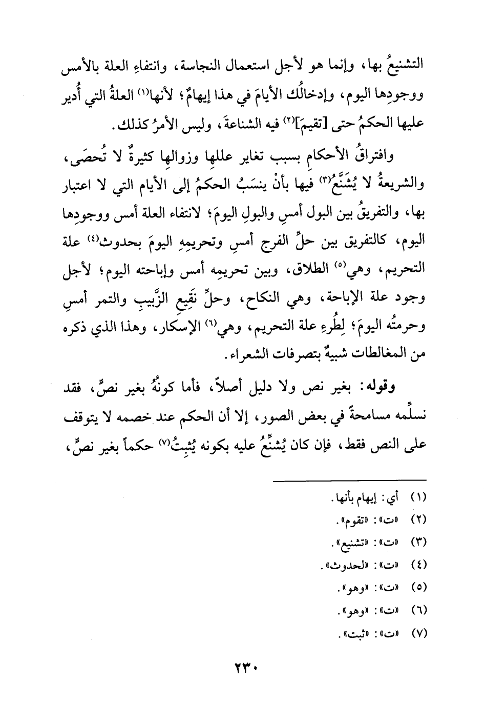 وافتراقُ الأحكامِ بسبب تغاير عللهِا وزوالهِا كثيرةٌ لا تُحصَى، والشريعةُ لا يُشَنَّعُ (¬3) فيها بأنْ ينسَبُ الحكمُ إلى الأيام التي لا اعتبار بها، والتفريقُ بين البول أمسِ والبولِ اليومَ؛ لانتفاء العلة أمس ووجودِها اليوم، كالتفريق بين حلِّ الفرج أمسِ وتحريمِهِ اليومَ بحدوث (¬4) علة التحريم، وهي (¬5) الطلاق، وبين تحريمِه أمس وإباحته اليوم؛ لأجل وجود علة الإباحة، وهي النكاح، وحلِّ نَقِيعِ الزَّبيبِ والتمر أمسِ وحرمتُه اليومَ؛ لِطُرءِ علة التحريم، وهي (¬6) الإسكار، وهذا الَّذي ذكره من المغالطات شبيهٌ بتصرفات الشعراء.