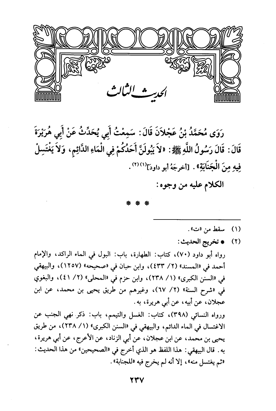 رَوَى مُحَمَّدُ بْنُ عَجْلَانَ قَالَ: سَمِعْتُ أَبي يُحَدِّثُ عَنْ أَبِي هُرَيْرَةَ قَالَ: قَالَ رَسُولُ اللَّهِ - صلى الله عليه وسلم -: "لَا يَبُولَنَّ أَحَدُكُمْ في الْمَاءَ الدَّائِم، وَلَا يَغْتَسِلْ فِيهِ مِنَ الْجَنَابَةِ". [أخرجَهُ أبو داود] (¬1) (¬2).