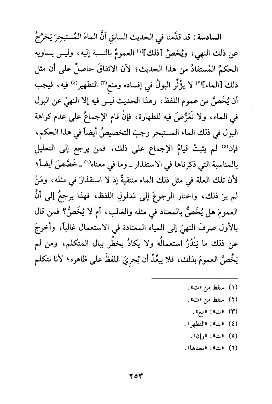 السادسة: قد قدَّمنا في الحديث السابقِ أنَّ الماءَ المُستبحِرَ يَخرُجُ عن ذلك النهي، ويُخصَّ [ذلك] (¬1) العمومُ بالنسبة إليه، وليس يساويه الحكمُ المُستفادُ من هذا الحديث؛ لأن الاتفاقَ حاصلٌ على أن مثل ذلك [الماء] (¬2) لا يؤُثّر البولُ في إفساده ومنعِ (¬3) التطهير (¬4) فيه، فيجب أن يُخَصَّ من عموم اللفظ، وهذا الحديث ليس فيه إلا النهيُ عن البول في الماء، ولا تَعَرُّضَ فيه للطهارة، فإنْ قام الإجماعُ على عدم كراهة البول في ذلك الماء المستبحر وجبَ التخصيصُ أيضًا في هذا الحكم، فإن (¬5) لم يثبتْ قيامُ الإجماع على ذلك، فمن يرجع إلى التعليل بالمناسبة التي ذكرناها في الاستقذار - وما في معناه (¬6) - خَصَّصَ أيضًا؛ لأن تلك العلة في مثل ذلك الماء منتفيةٌ إذ لا استقذارَ في مثله، ومَنْ لم يرَ ذلك، واختار الرجوعَ إلى مَدلولِ اللفظ، فهذا يرجعُ إلى أنَّ العمومَ هل يُخَصُّ بالمعتاد في مثله والغالب، أم لا يُخَصُّ؟ فمن قال بالأول صرفَ النهيَ إلى المياه المعتادة في الاستعمال غالباً، وأخرجَ عن ذلك ما يَنْدُرُ استعمالُه ولا يكادُ يخطُر ببال المتكلم، ومن لم يَخُصَّ العمومَ بذلك، فلا يبعُدُ أن يُجرِيَ اللفظَ على ظاهره؛ لأنا نتكلم