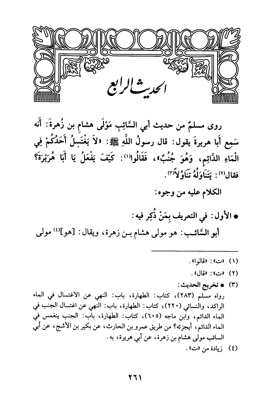 روى مسلمٌ من حديث أبي السَّائِبِ مَوْلَى هشامِ بن زُهرةَ: أَنه سَمع أَبا هريرةَ يقول: قال رسولُ اللَّهِ - صلى الله عليه وسلم -: "لاَ يَغْتَسِلُ أَحَدُكُمْ فِي الْمَاءِ الدَّائِمِ، وَهُوَ جُنُبٌ"، فَقَالُوا (¬1): كَيْفَ يَفْعَلُ يَا أَبَا هُرَيْرَةَ؟ فقال (¬2): يَتَنَاوَلُهُ تَنَاوُلاً (¬3).