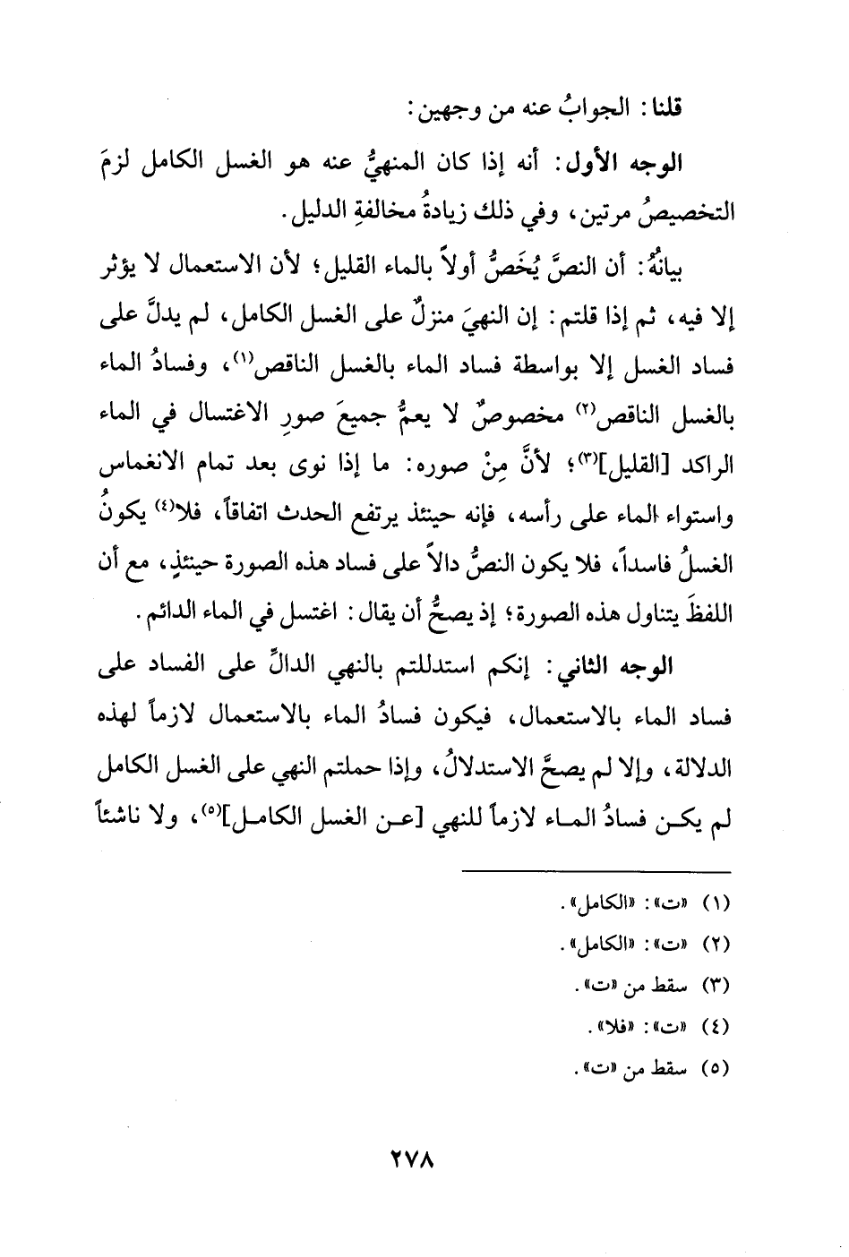 الوجه الثاني: إنكم استدللتم بالنهي الدالِّ على الفساد على فساد الماء بالاستعمال، فيكون فسادُ الماء بالاستعمال لازماً لهذه الدلالة، وإلا لم يصحَّ الاستدلالُ، وإذا حملتم النهي على الغسل الكامل لم يكن فسادُ الماء لازماً للنهي [عن الغسل الكامل] (¬5)، ولا ناشئاً